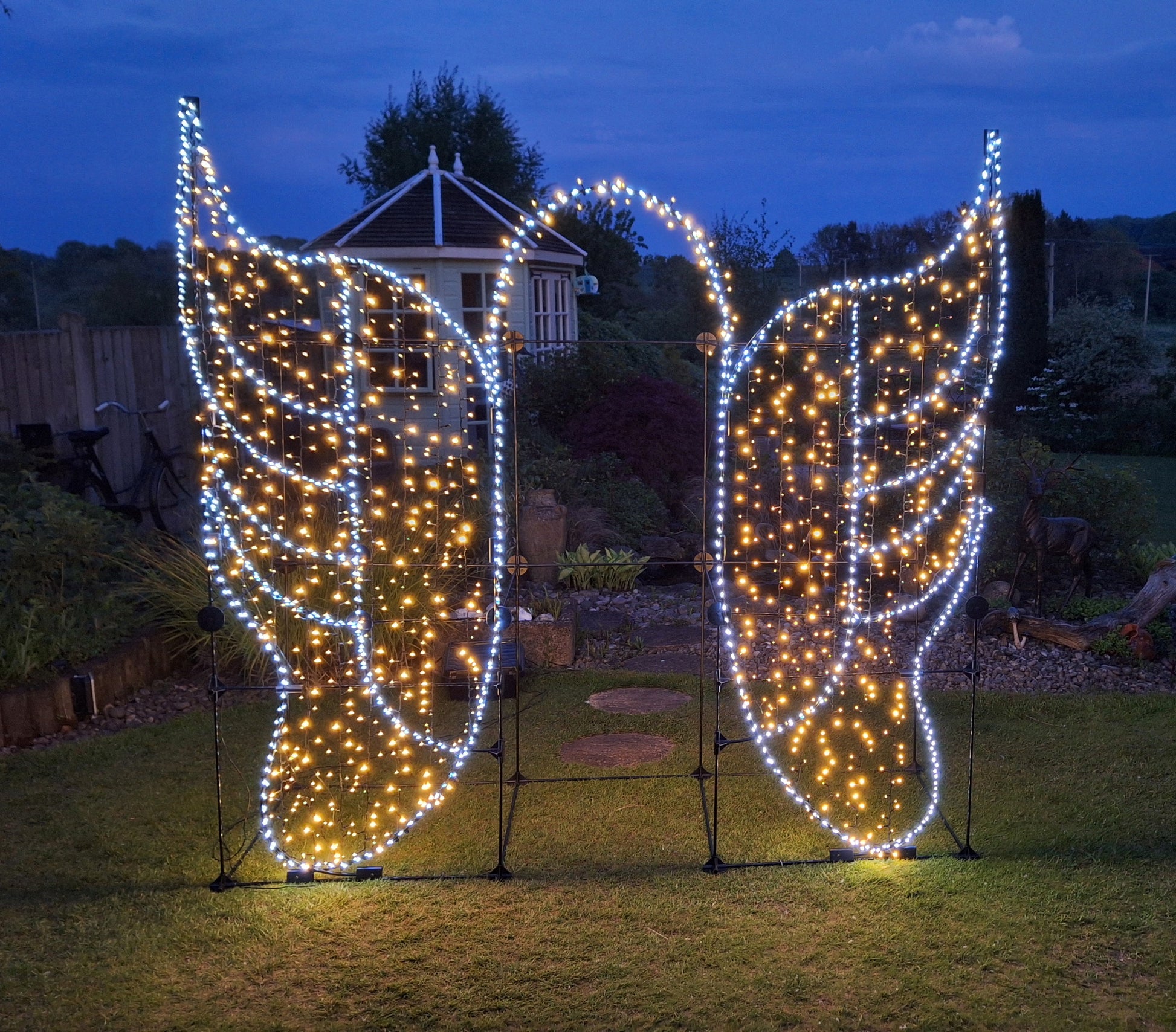 Angel Wings are a simple 2 hour build display (with lights) It is a versatile sculpture because it can be set up as a photo posing opportunity or as a tunnel to go in front of a door or on a pathway. It can be made with a tilting Halo that has the ability to rise up or down to suit the height of the person being photographed. The standard arch version is 2mtrs wide and 1.8mtrs high.