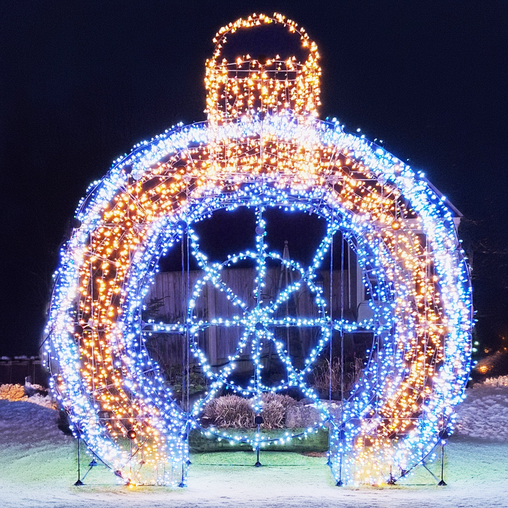 The walk through bauble is one of the largest sculptures that can be made with Festive Frames. Standing at 3 mtrs High and 2.8mtrs wide. It offers two versions. The walk through version and the filled in scene setter version.