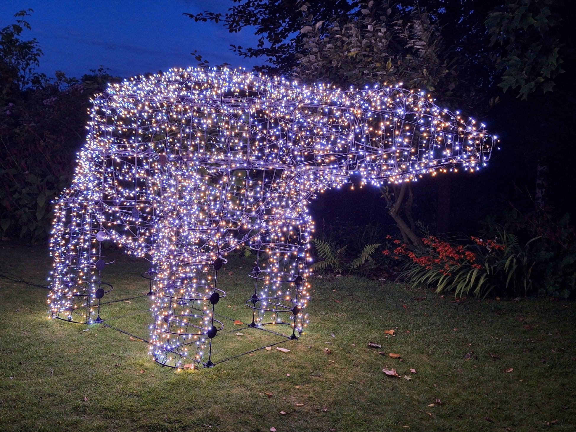 The Polar Bear is the most fearsome creature on the planet yet its image is intrinsically connected with the festive season. This sculpture is by far the favorite of the team at Festive Frames as it shows off the incredible versatility of the framework. It sculpture takes about 3 hours to build with lights and represents a full size male bear. Approximately 2.7 mtrs long (9 ft) and 1.55 mtrs high (5 ft). Nobody in town, even commercial displays will have anything like this.